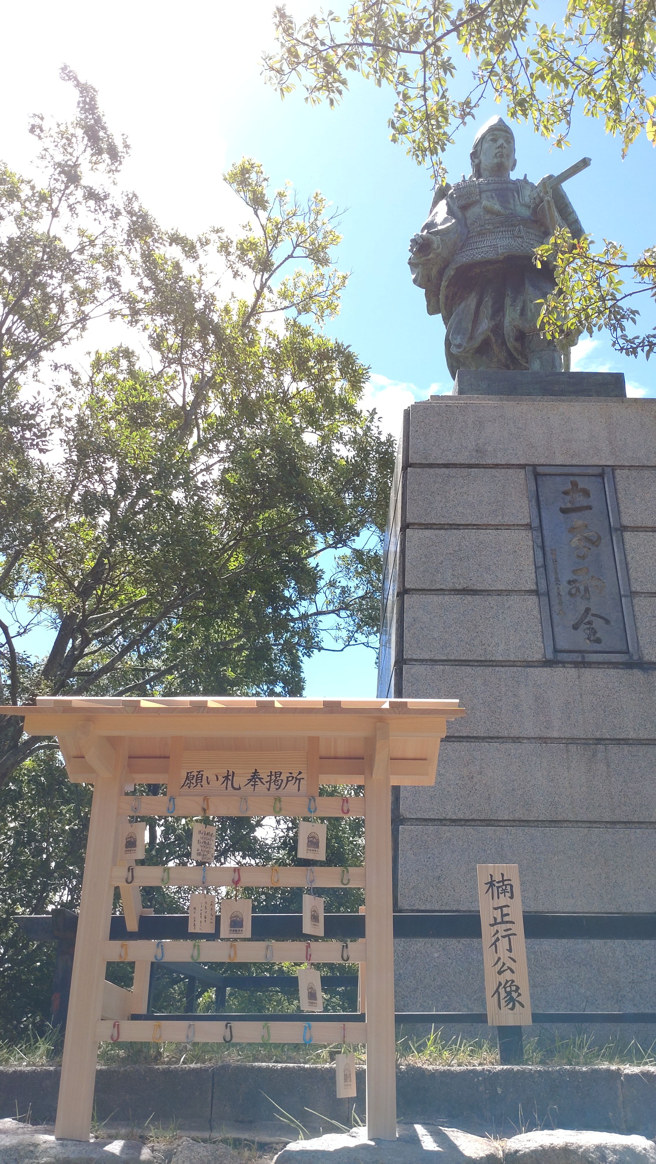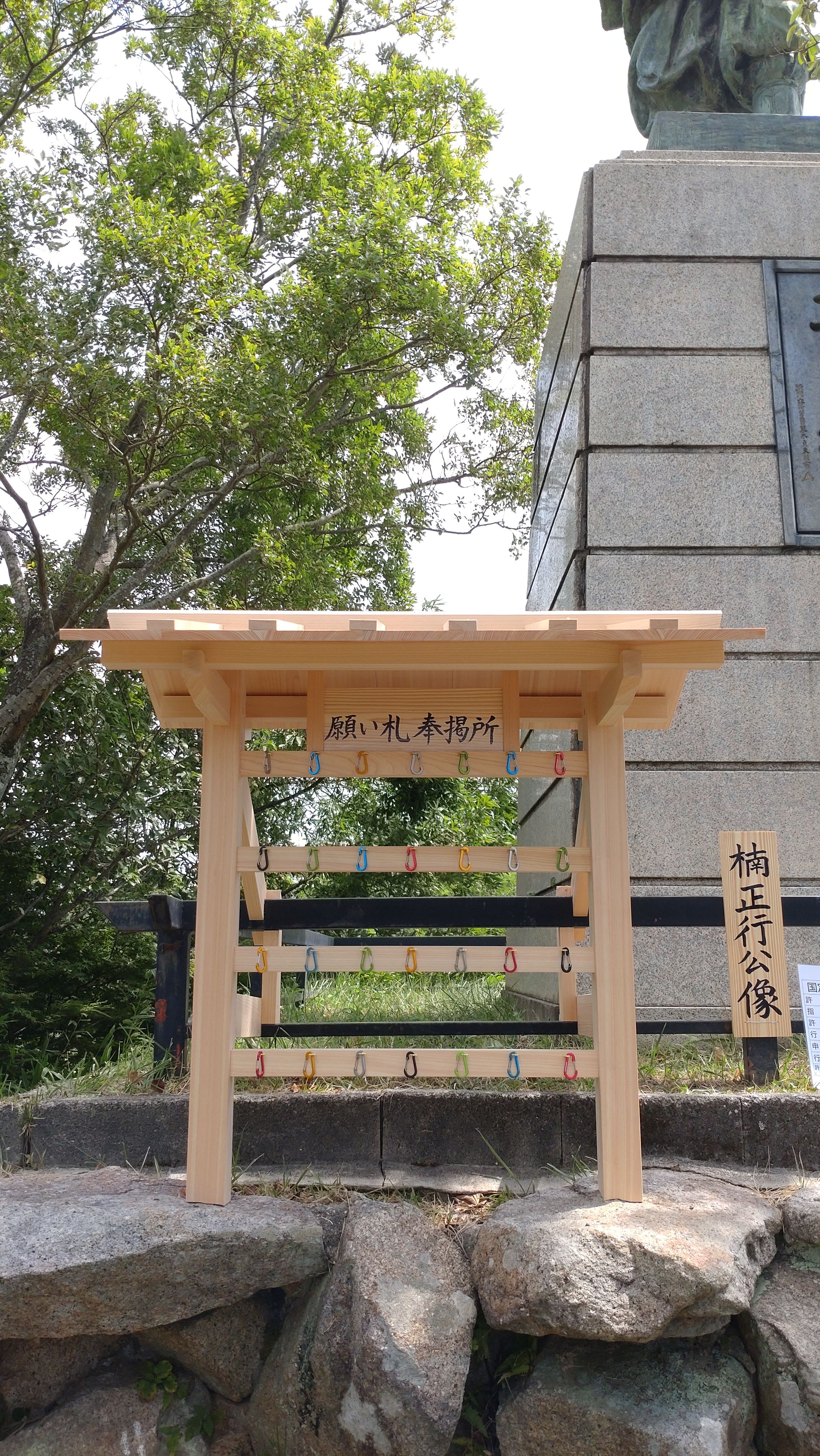 飯盛山山頂の楠正行公像の前には、「願い札奉掲所」がございますので、願いを込めて札をお掛けください。