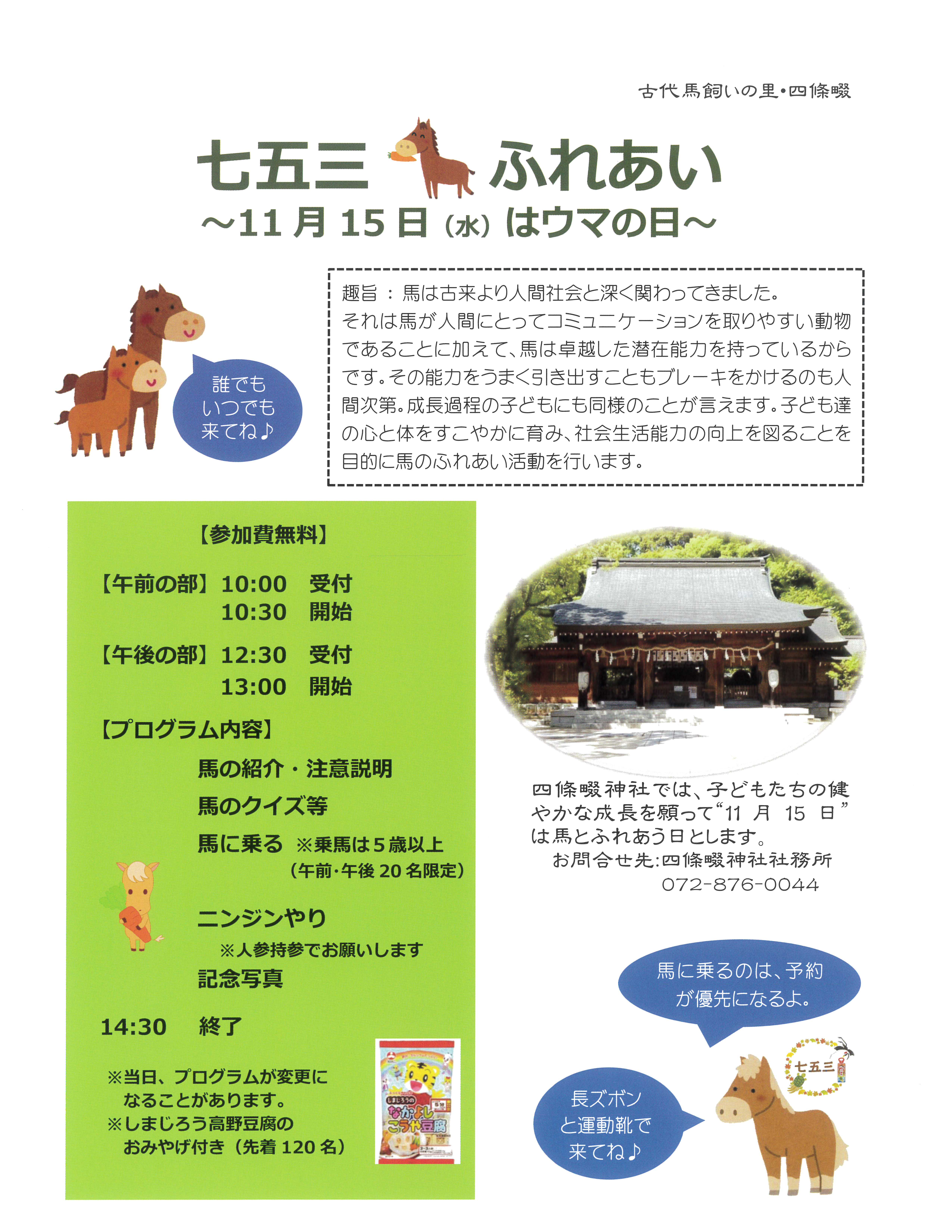 午前10時30分より午後3時頃迄、乗馬やニンジンやり、記念撮影など、どなたでも無料でご参加いただけますので、ぜひお誘いあわせのうえ神社へお越しください。